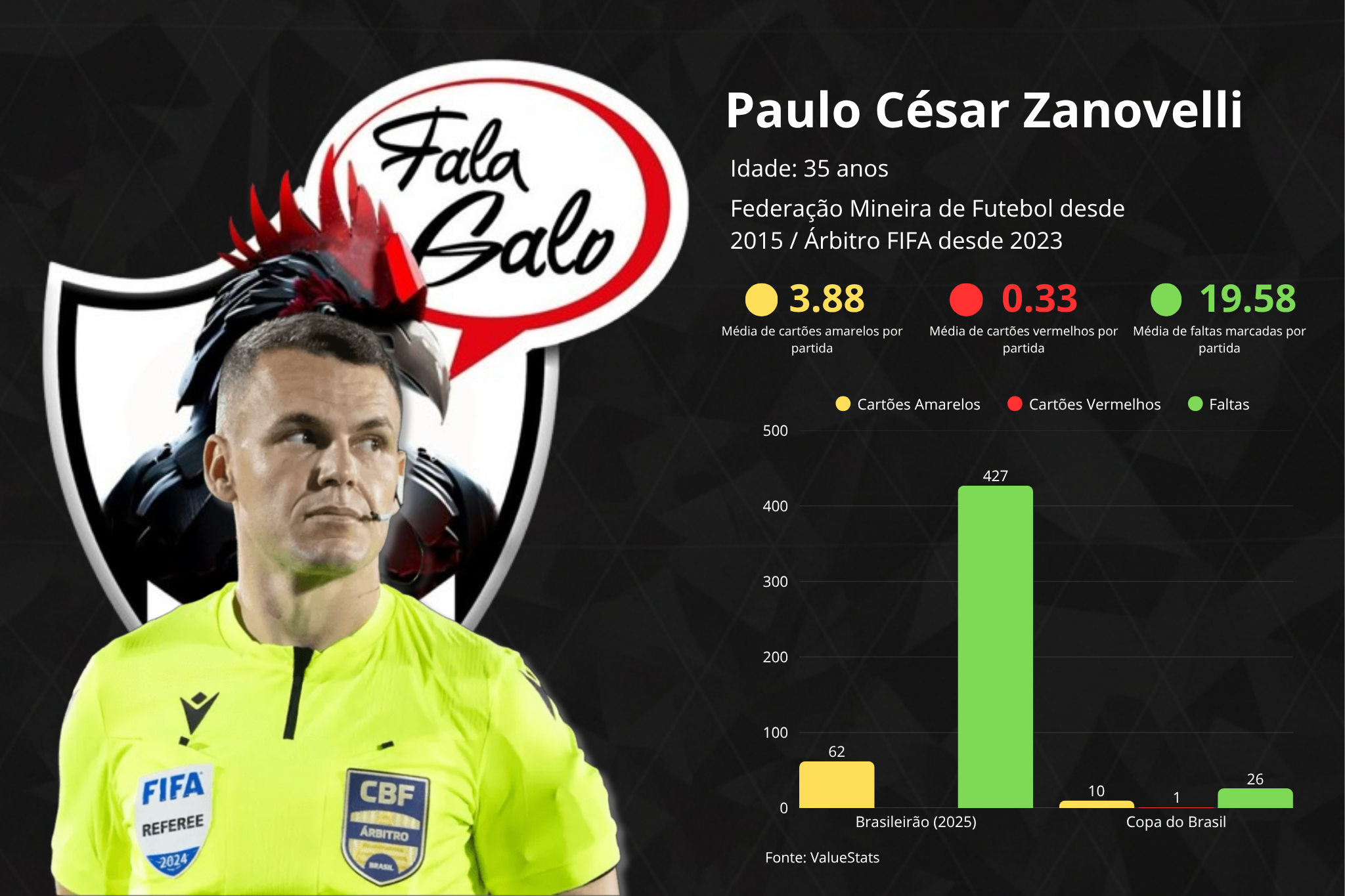 Zanovelli, tem 35 anos, e nesta temporada, comandou 14 partidas do Brasileirão, marcando 427 faltas e distribuindo 62 cartões amarelos, uma média de 4.43 (por jogo).