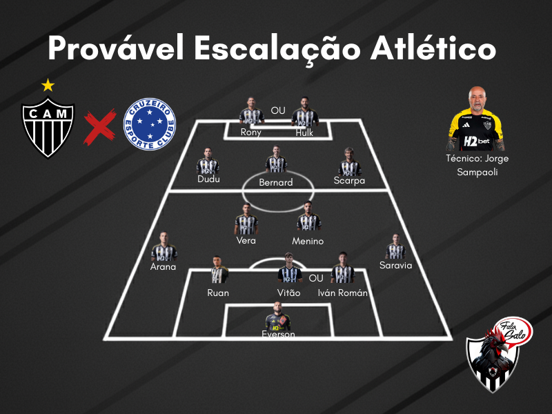 Portanto, o provável time titular do Atlético tem: Everson; Saravia, Ruan, Vitão (Iván Román) e Guilherme Arana; Fausto Vera, Gabriel Menino e Gustavo Scarpa; Bernard, Dudu e Hulk (Rony). Técnico: Jorge Sampaoli.