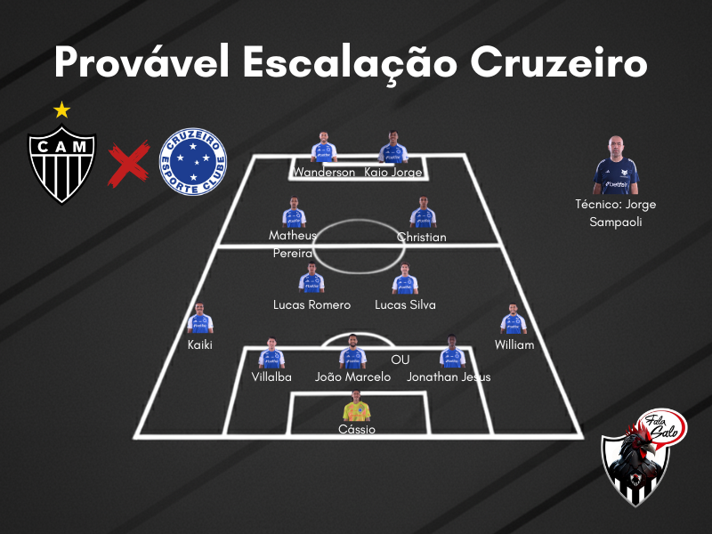 Portanto, o provável time titular do Cruzeiro tem: Cássio; William, Jonathan Jesus (João Marcelo), Villalba e Kaiki; Lucas Silva, Lucas Romero, Christian e Matheus Pereira; Wanderson e Kaio Jorge. Técnico: Leonardo Jardim.