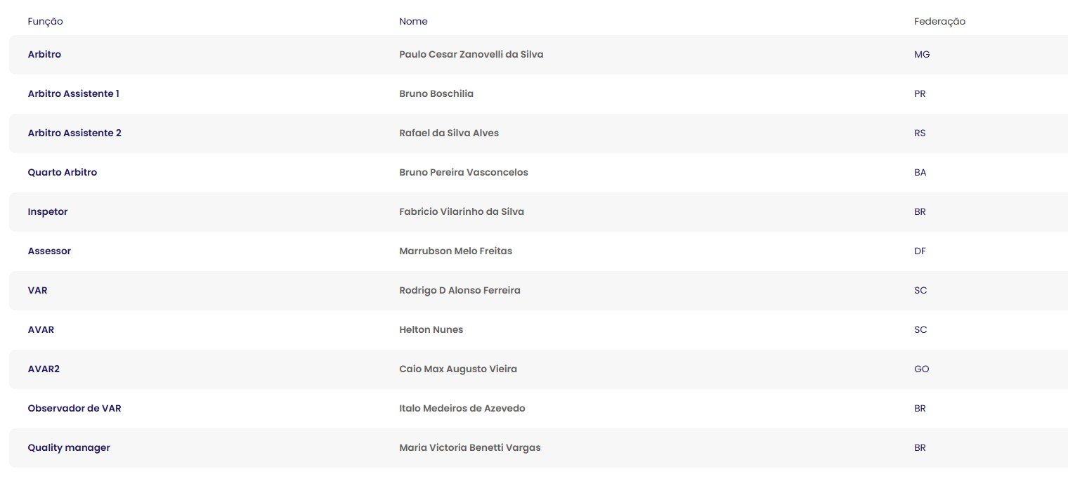 Para o duelo, a Confederação Brasileira de Futebol (CBF) divulgou a esclala completa de árbitros. O apito será comandado pelo mineiro Paulo César Zanovelli, já os auxiliares serão Bruno Boschilia, da Federação Parananese e Rafael da Silva Alves, da Federação Gaúcha. O VAR será comandado por Rodrigo D’Alonso Ferreira, da Federação Catarinense.