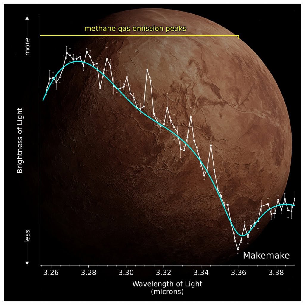 Com cerca de 1.430 km de diâmetro, Makemake tem cerca de dois terços do tamanho de Plutão. O JWST detectou o metano por meio de uma assinatura espectral na luz solar refletida pelas moléculas desse gás, confirmando sua presença em estado gasoso.