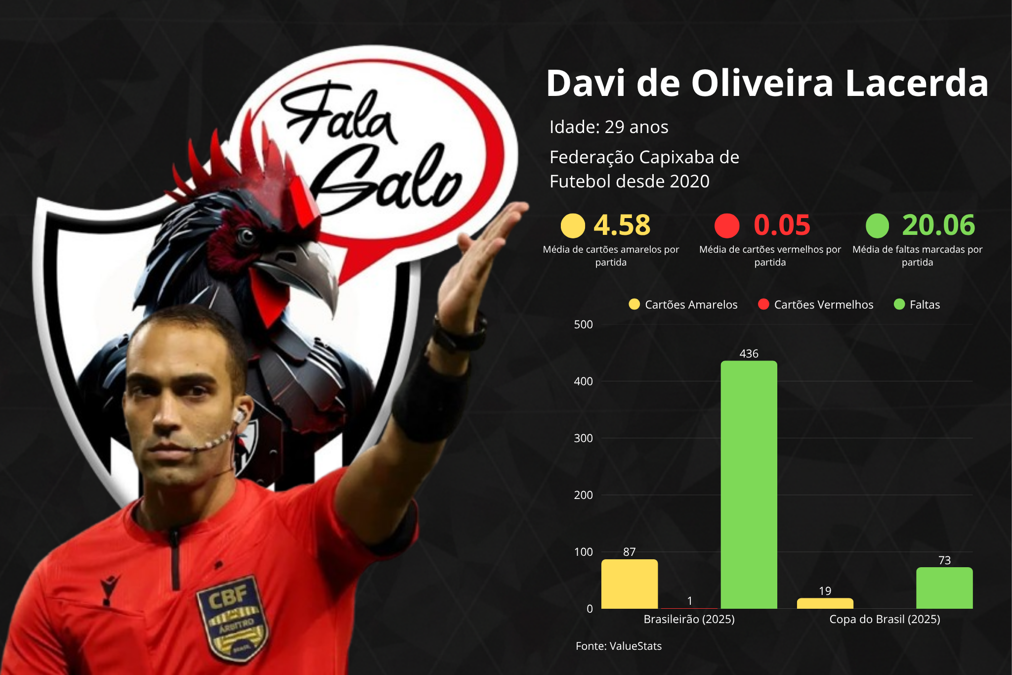 Davi de Oliveira Lacerda tem 29 anos, e está na Federação Capixaba de Futebol desde 2020. Nesta temporada, comandou 19 partidas no Brasileirão. Quatro delas foram do Atlético.