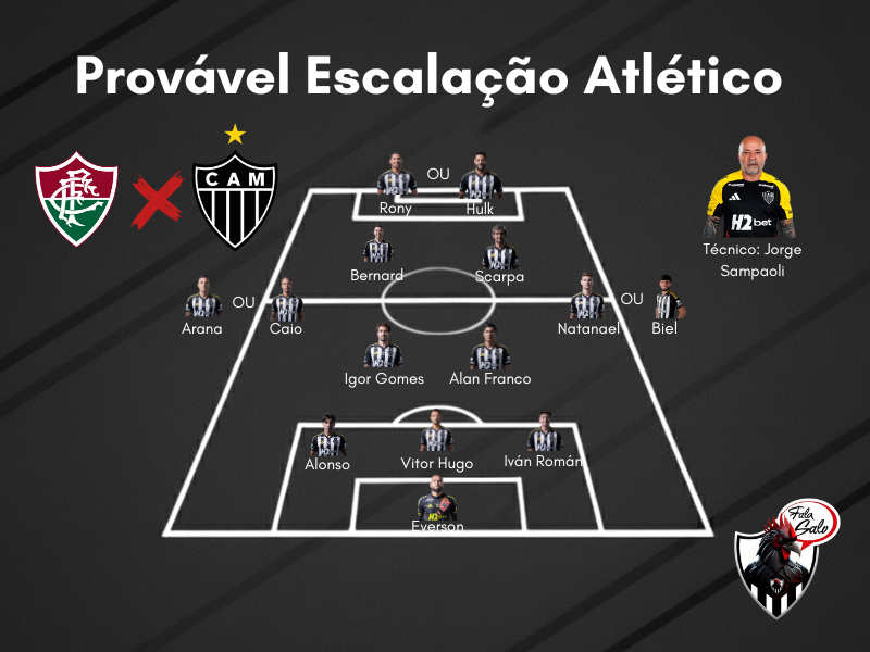 Sendo assim, o provável time titular do Atlético para enfrentar o Fluminense tem: Everson; Iván Román, Vitor Hugo e Junior Alonso; Natanael (Biel), Alan Franco, Igor Gomes e Caio Paulista (Guilherme Arana); Bernard, Gustavo Scarpa e Hulk (Rony). Técnico: Jorge Sampaoli.