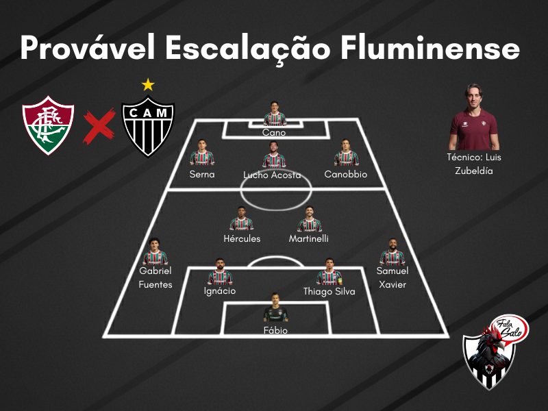 Sendo assim, o provável time titular do Fluminense tem: Fábio; Samuel Xavier, Thiago Silva, Ignácio e Gabriel Fuentes; Martinelli, Hércules, Agustín Canobbio, Lucho Acosta e Serna; Cano. Técnico: Luis Zubeldía.