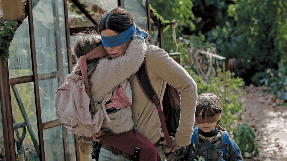 O espectador acompanha Malorie, uma mãe que precisa guiar seus filhos em busca de um refúgio, usando vendas nos olhos para sobreviver e enfrentando perigos físicos e psicológicos ao longo da jornada.